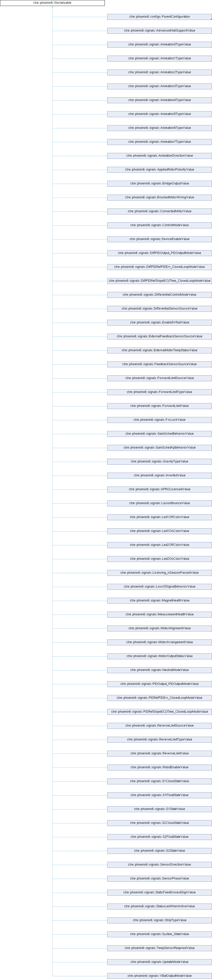 Implemented in ctre::phoenix6::configs::AudioConfigs, ctre::phoenix6::configs::CANcoderConfiguration, ctre::phoenix6::configs::CANdiConfiguration, ctre::phoenix6::configs::CANdleConfiguration, ctre::phoenix6::configs::CANdleFeaturesConfigs, ctre::phoenix6::configs::CANrangeConfiguration, ctre::phoenix6::configs::ClosedLoopGeneralConfigs, ctre::phoenix6::configs::ClosedLoopRampsConfigs, ctre::phoenix6::configs::CommutationConfigs, ctre::phoenix6::configs::CurrentLimitsConfigs, ctre::phoenix6::configs::CustomBrushlessMotorConfigs, ctre::phoenix6::configs::CustomParamsConfigs, ctre::phoenix6::configs::DifferentialConstantsConfigs, ctre::phoenix6::configs::DifferentialSensorsConfigs, ctre::phoenix6::configs::DigitalInputsConfigs, ctre::phoenix6::configs::EmptyConfiguration, ctre::phoenix6::configs::ExternalFeedbackConfigs, ctre::phoenix6::configs::ExternalTempConfigs, ctre::phoenix6::configs::FeedbackConfigs, ctre::phoenix6::configs::FovParamsConfigs, ctre::phoenix6::configs::GyroTrimConfigs, ctre::phoenix6::configs::HardwareLimitSwitchConfigs, ctre::phoenix6::configs::LEDConfigs, ctre::phoenix6::configs::MagnetSensorConfigs, ctre::phoenix6::configs::MotionMagicConfigs, ctre::phoenix6::configs::MotorOutputConfigs, ctre::phoenix6::configs::MountPoseConfigs, ctre::phoenix6::configs::OpenLoopRampsConfigs, ctre::phoenix6::configs::Pigeon2Configuration, ctre::phoenix6::configs::Pigeon2FeaturesConfigs, ctre::phoenix6::configs::ProximityParamsConfigs, ctre::phoenix6::configs::PWM1Configs, ctre::phoenix6::configs::PWM2Configs, ctre::phoenix6::configs::QuadratureConfigs, ctre::phoenix6::configs::Slot0Configs, ctre::phoenix6::configs::Slot1Configs, ctre::phoenix6::configs::Slot2Configs, ctre::phoenix6::configs::SlotConfigs, ctre::phoenix6::configs::SoftwareLimitSwitchConfigs, ctre::phoenix6::configs::TalonFXConfiguration, ctre::phoenix6::configs::TalonFXSConfiguration, ctre::phoenix6::configs::ToFParamsConfigs, ctre::phoenix6::configs::TorqueCurrentConfigs, ctre::phoenix6::configs::VoltageConfigs, ctre::phoenix6::signals::AdvancedHallSupportValue, ctre::phoenix6::signals::Animation0TypeValue, ctre::phoenix6::signals::Animation1TypeValue, ctre::phoenix6::signals::Animation2TypeValue, ctre::phoenix6::signals::Animation3TypeValue, ctre::phoenix6::signals::Animation4TypeValue, ctre::phoenix6::signals::Animation5TypeValue, ctre::phoenix6::signals::Animation6TypeValue, ctre::phoenix6::signals::Animation7TypeValue, ctre::phoenix6::signals::AnimationDirectionValue, ctre::phoenix6::signals::AppliedRotorPolarityValue, ctre::phoenix6::signals::BridgeOutputValue, ctre::phoenix6::signals::BrushedMotorWiringValue, ctre::phoenix6::signals::ConnectedMotorValue, ctre::phoenix6::signals::ControlModeValue, ctre::phoenix6::signals::DeviceEnableValue, ctre::phoenix6::signals::DifferentialControlModeValue, ctre::phoenix6::signals::DifferentialSensorSourceValue, ctre::phoenix6::signals::DiffPIDOutput_PIDOutputModeValue, ctre::phoenix6::signals::DiffPIDRefPIDErr_ClosedLoopModeValue, ctre::phoenix6::signals::DiffPIDRefSlopeECUTime_ClosedLoopModeValue, ctre::phoenix6::signals::Enable5VRailValue, ctre::phoenix6::signals::ExternalFeedbackSensorSourceValue, ctre::phoenix6::signals::ExternalMotorTempStatusValue, ctre::phoenix6::signals::FeedbackSensorSourceValue, ctre::phoenix6::signals::ForwardLimitSourceValue, ctre::phoenix6::signals::ForwardLimitTypeValue, ctre::phoenix6::signals::ForwardLimitValue, ctre::phoenix6::signals::FrcLockValue, ctre::phoenix6::signals::GainSchedBehaviorValue, ctre::phoenix6::signals::GainSchedKpBehaviorValue, ctre::phoenix6::signals::GravityTypeValue, ctre::phoenix6::signals::InvertedValue, ctre::phoenix6::signals::IsPROLicensedValue, ctre::phoenix6::signals::LarsonBounceValue, ctre::phoenix6::signals::Led1OffColorValue, ctre::phoenix6::signals::Led1OnColorValue, ctre::phoenix6::signals::Led2OffColorValue, ctre::phoenix6::signals::Led2OnColorValue, ctre::phoenix6::signals::Licensing_IsSeasonPassedValue, ctre::phoenix6::signals::LossOfSignalBehaviorValue, ctre::phoenix6::signals::MagnetHealthValue, ctre::phoenix6::signals::MeasurementHealthValue, ctre::phoenix6::signals::MotorAlignmentValue, ctre::phoenix6::signals::MotorArrangementValue, ctre::phoenix6::signals::MotorOutputStatusValue, ctre::phoenix6::signals::NeutralModeValue, ctre::phoenix6::signals::PIDOutput_PIDOutputModeValue, ctre::phoenix6::signals::PIDRefPIDErr_ClosedLoopModeValue, ctre::phoenix6::signals::PIDRefSlopeECUTime_ClosedLoopModeValue, ctre::phoenix6::signals::ReverseLimitSourceValue, ctre::phoenix6::signals::ReverseLimitTypeValue, ctre::phoenix6::signals::ReverseLimitValue, ctre::phoenix6::signals::RobotEnableValue, ctre::phoenix6::signals::S1CloseStateValue, ctre::phoenix6::signals::S1FloatStateValue, ctre::phoenix6::signals::S1StateValue, ctre::phoenix6::signals::S2CloseStateValue, ctre::phoenix6::signals::S2FloatStateValue, ctre::phoenix6::signals::S2StateValue, ctre::phoenix6::signals::SensorDirectionValue, ctre::phoenix6::signals::SensorPhaseValue, ctre::phoenix6::signals::StaticFeedforwardSignValue, ctre::phoenix6::signals::StatusLedWhenActiveValue, ctre::phoenix6::signals::StripTypeValue, ctre::phoenix6::signals::System_StateValue, ctre::phoenix6::signals::TempSensorRequiredValue, ctre::phoenix6::signals::UpdateModeValue, and ctre::phoenix6::signals::VBatOutputModeValue.